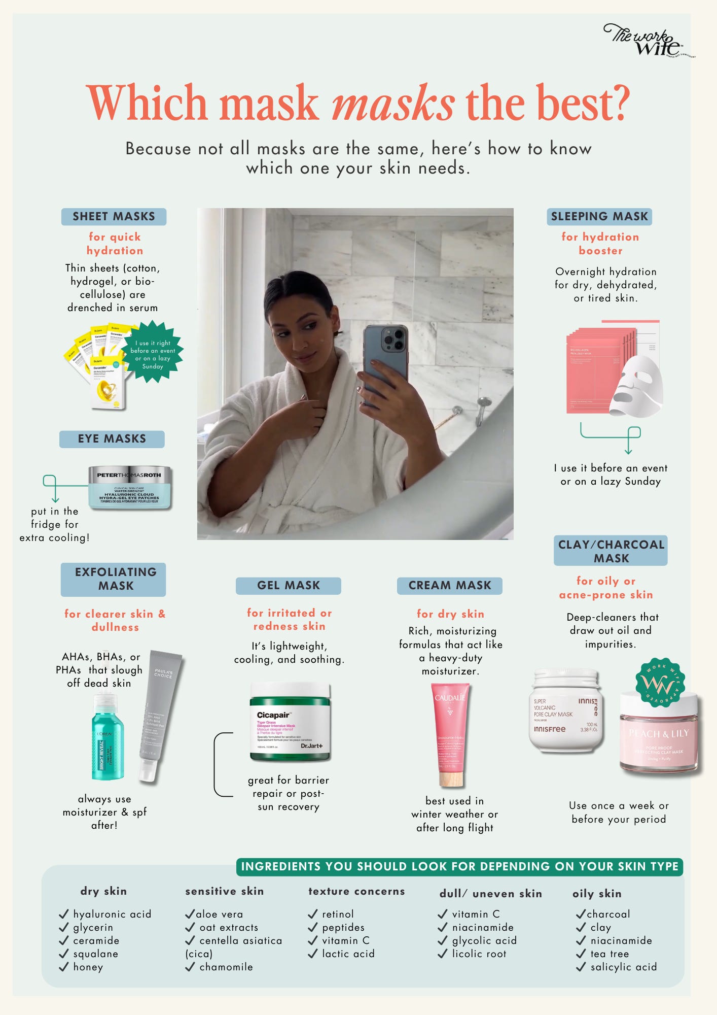 Well, you can use the handy dandy chart I made below based on your skin’s type and skincare needs. The most popular options are sheet masks for quick hydration, I love Dr. Jart for that. A detox mask for oily skin & pores, I love Caudalie for that, and then a clay/charcoal mask, I love Innisfree for that.
